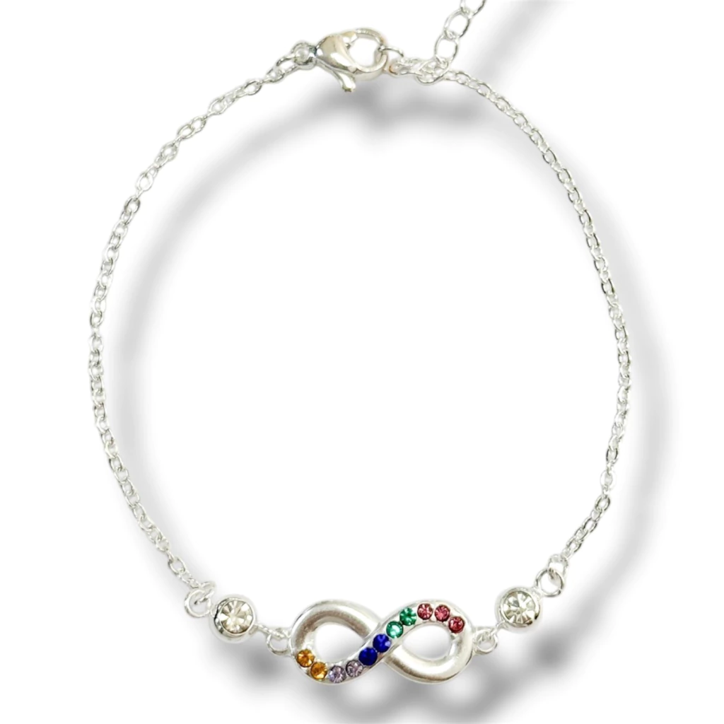 Este modelo tiene un infinito con strass de colores, lo que le da un brillo hermoso. Tené en cuenta que con el uso pueden salirse.