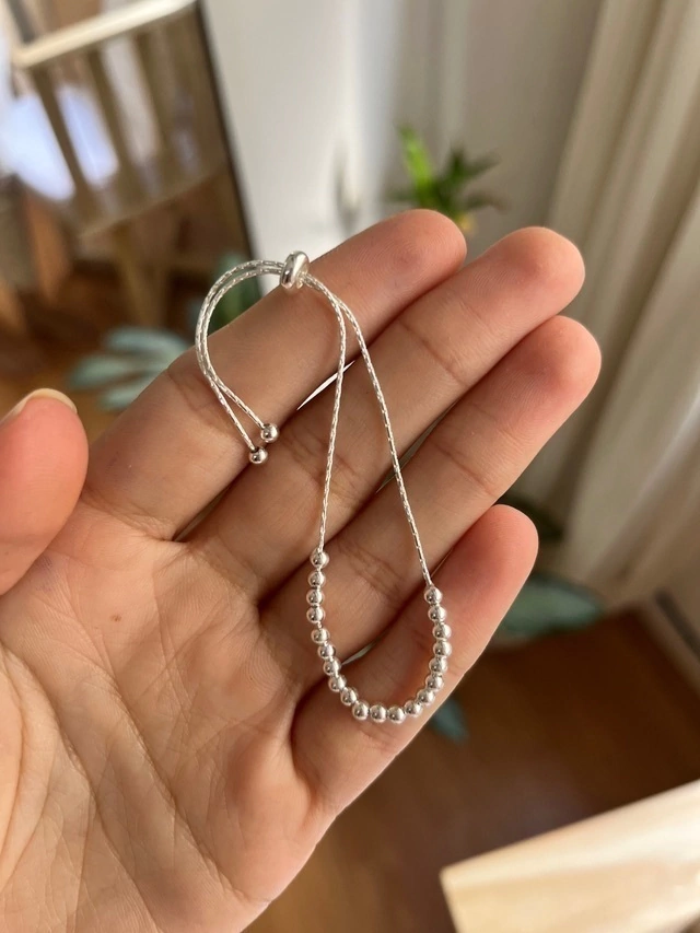 Esta pulsera es la clásica de bolitas pero además es regulable. Tiene una terminación perfectamente pulida, lo que lo hace brillar.